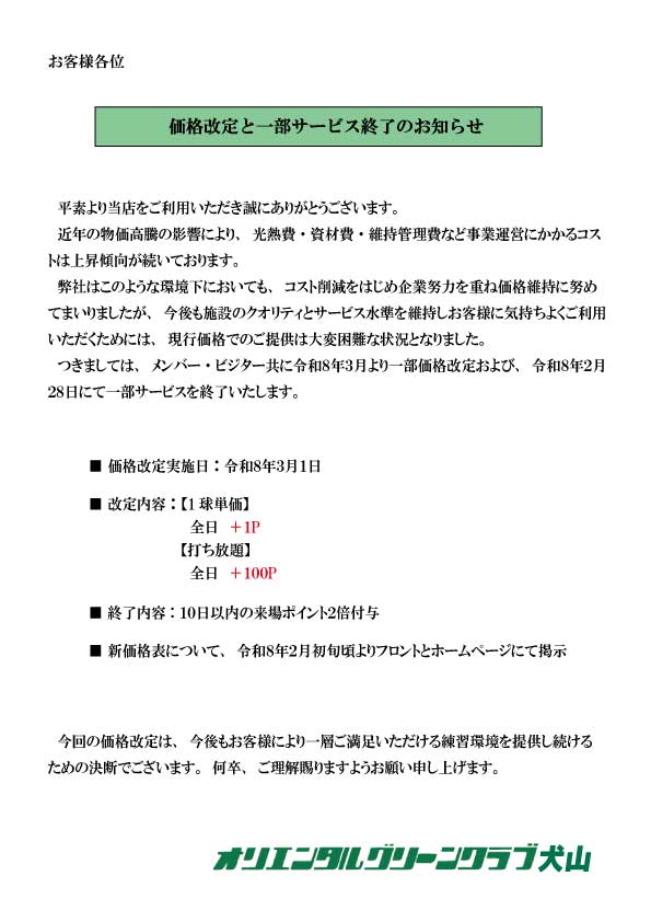 オリエンタルグループの全ゴルフ練習場で同様のメンバー待遇が受けられます。